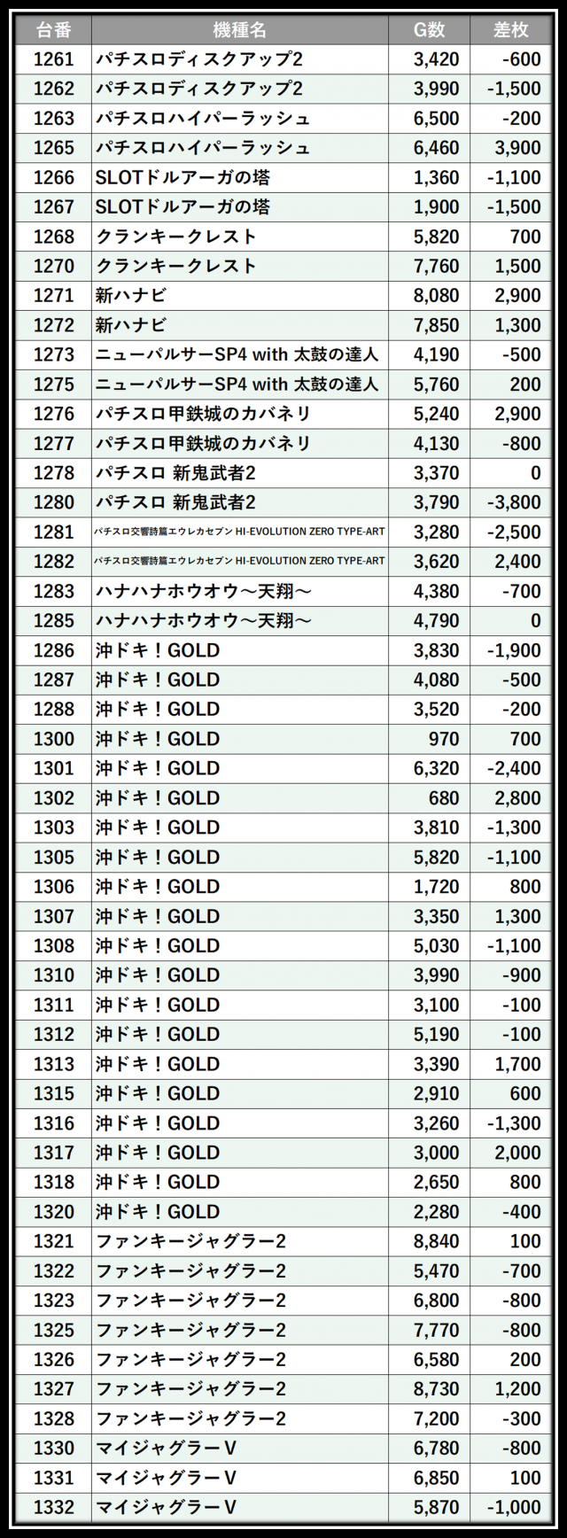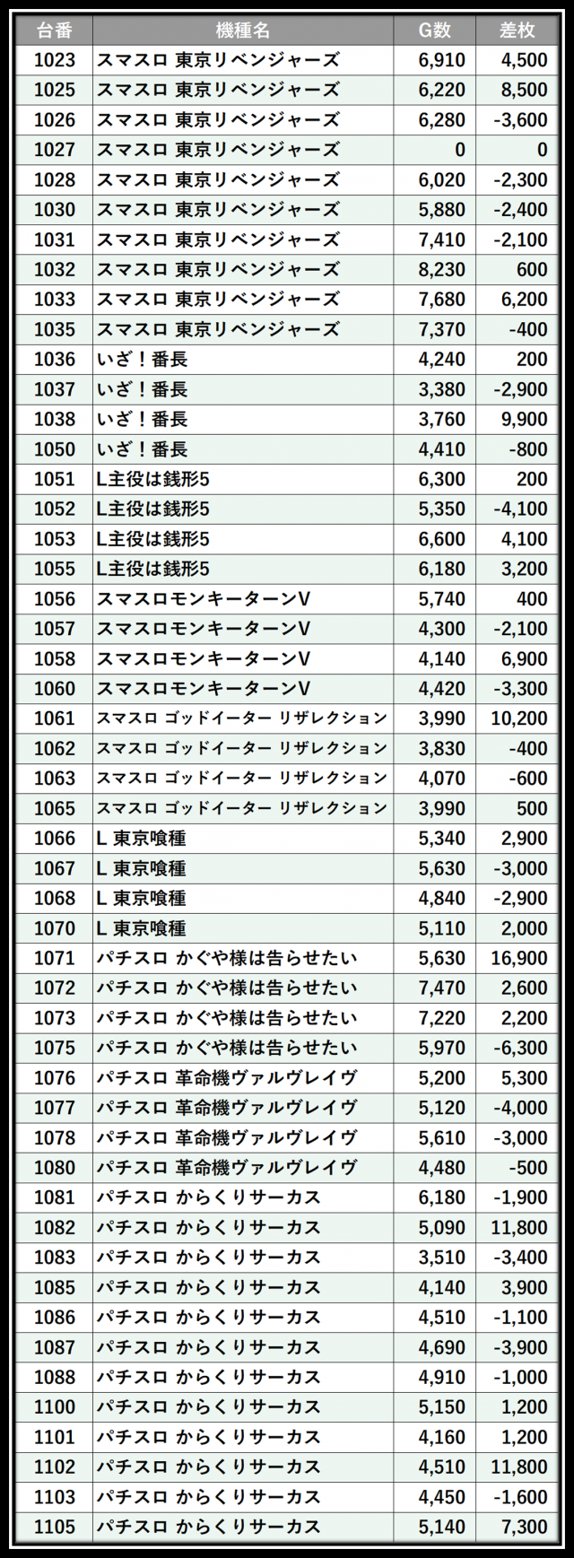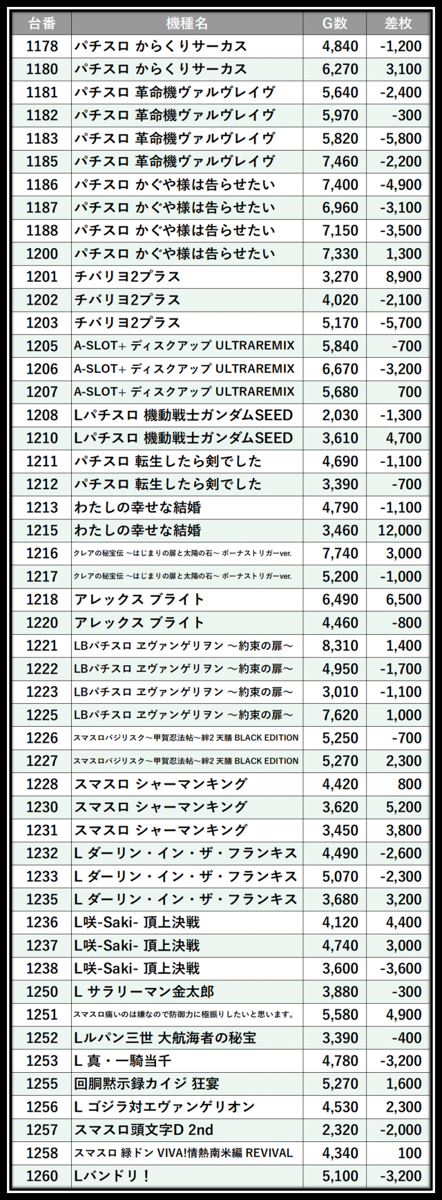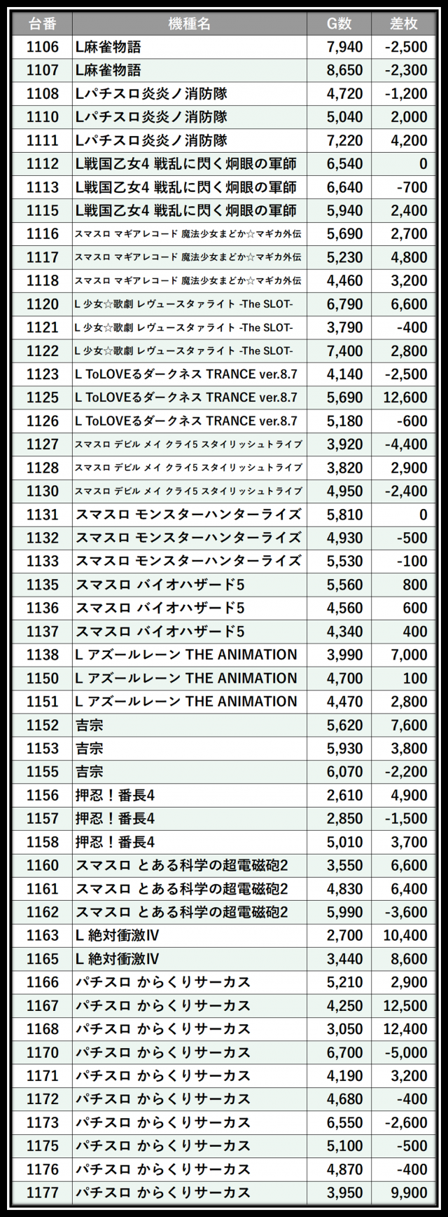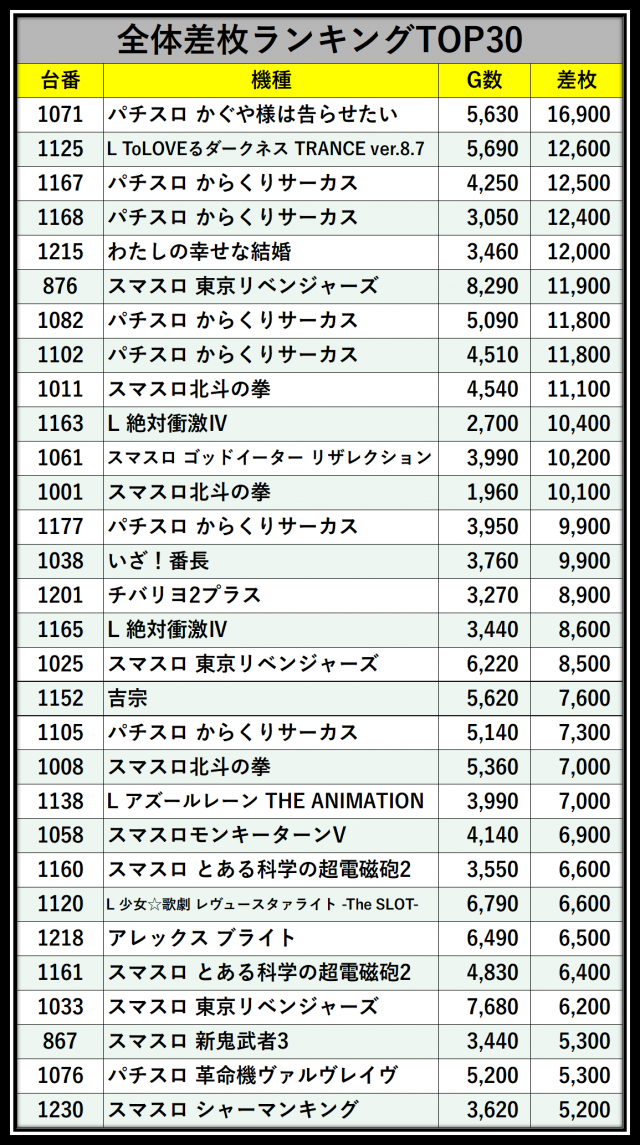 ※差枚数順に掲載しています