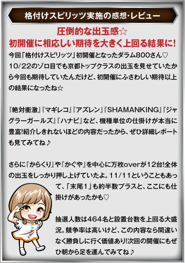 11月11日(火) ダラム800にて、DMMぱちタウンの「格付けスピリッツ」を実施。