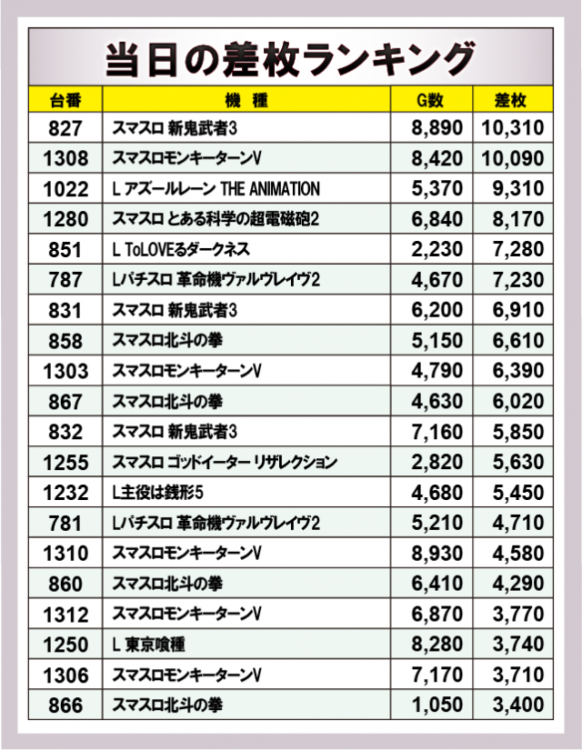 今回の差枚ランキングでは、『スマスロ 新鬼武者3』と『スマスロモンキーターンV』がともに万枚到達のビッグインパクトを記録し、トップ2を鮮烈に飾った。その後も『L アズールレーン THE ANIMATION』『スマスロ とある科学の超電磁砲2』『L ToLOVEるダークネス』など、人気どころが揃って高水準の差枚を叩き出す展開に。さらにTOP20は3,400枚超えからとなっており、全体的にスマスロ勢がしっかり主導権を握っていた!