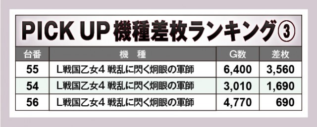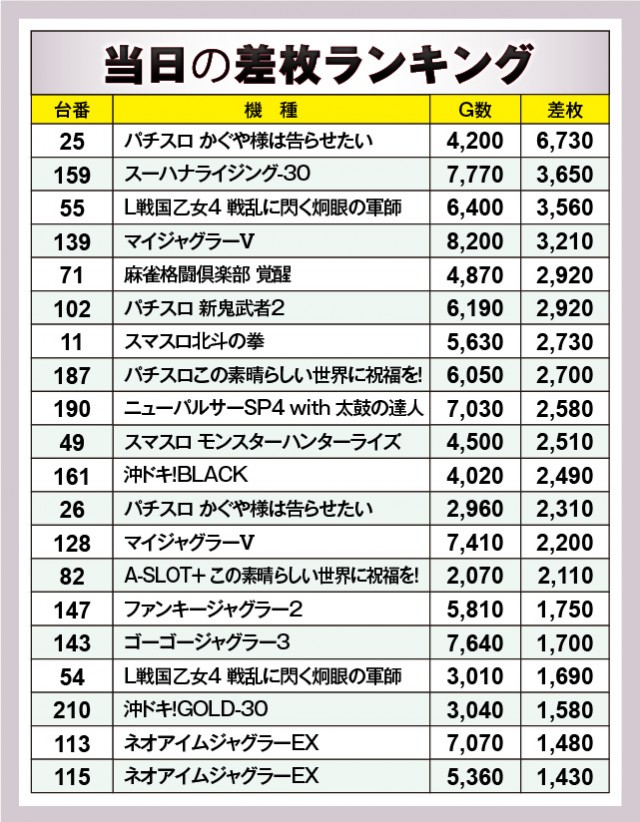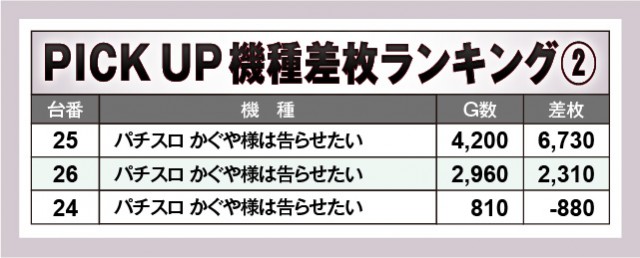 『パチスロ かぐや様は告らせたい』にて6,730枚の大台突破が飛び出し、当日の店内の盛り上がりを牽引。さらに『スーハナライジング-30』『L戦国乙女4 戦乱に閃く炯眼の軍師』もまとまった出玉で追随しており、ファンは力強くレバーを叩けたことだろう。沖スロ・ノーマル機も名を連ねている点から、スペック問わず幅広い機種で楽しめる1日だったのが窺えるばかりだ。