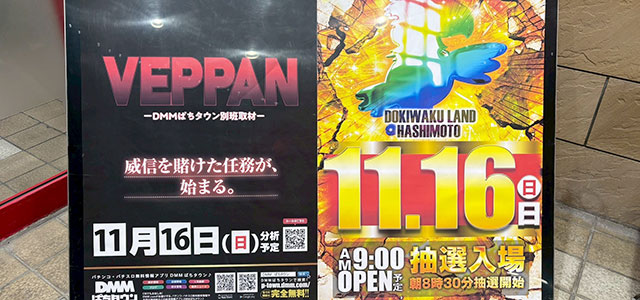 DMMぱちタウン取材班〝別班〟が威信を賭けて執り行う「VEPPAN」が、11月16日に「ドキわくランド橋本店」にて実施された。朝から60人のファンが足を運び、彼らは大きな期待を胸に開店の瞬間を待ちわびていたのが印象に残る。同店もまた力強い意気込みをみせており、誰もが盛り上がりを予感していたことだろう。さっそく以下からは詳細データとともに店内の様子をお伝えしていくため、本レポートを最後までご覧いただきたい!