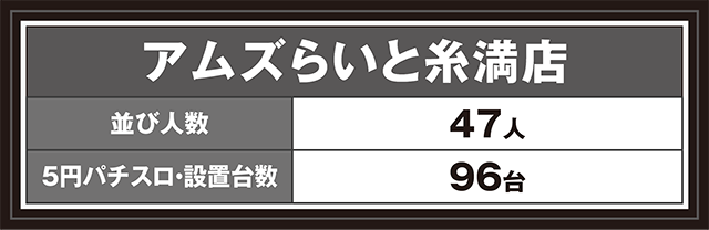 11月29日、沖縄県糸満市にある「アムズらいと糸満店」へと向かった。今回の取材は、「スマート取材」だ。パチスロをチェックすると、スタイリッシュに活躍をしている姿があった。