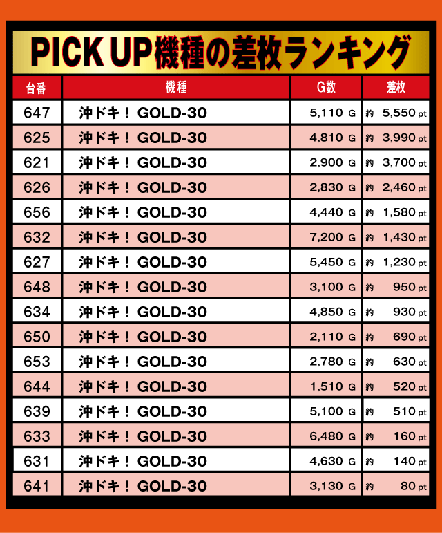 『沖ドキ!GOLD-30』は16台がプラスpt。なかでも647番台が+5,550ptと見事な活躍を見せた。