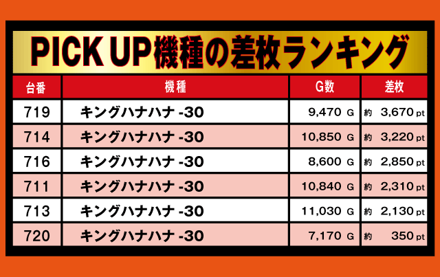 『キングハナハナ-30』は+3,000pt超1台、+2,000pt超が4台と圧倒的な好成績を残している。