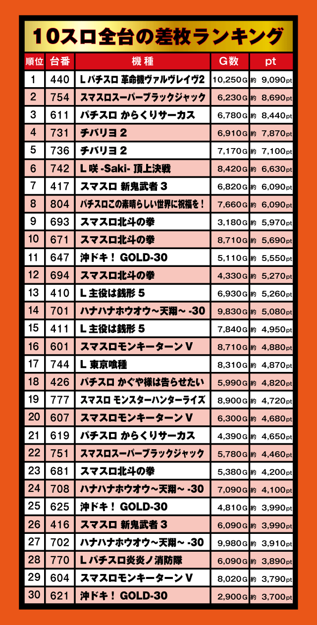 『Lパチスロ 革命機ヴァルヴレイヴ2』440番台が+9,090ptで、この日一番の好成績を残していた。そして『スマスロスーパーブラックジャック』754番台が+8,690pt、『パチスロ からくりサーカス』611番台が+8,440ptとつづく。他にも4桁プラスptの台が多数誕生し、店内の盛り上がりを支えていた。