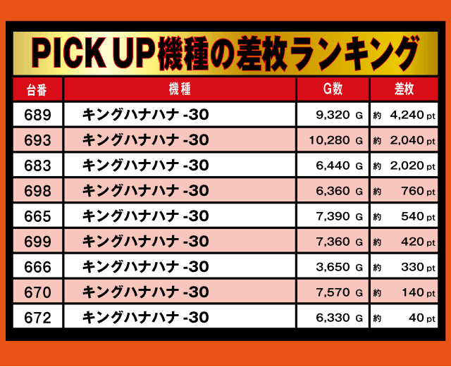 『キングハナハナ-30』は689番台の+4,240ptをはじめ、+2,000pt超が2台と絶好調だった。