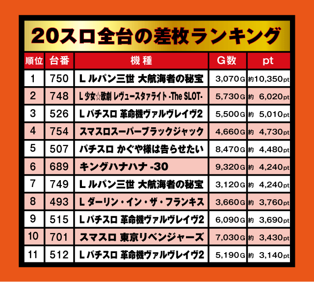 『Lルパン三世 大航海者の秘宝』750番台が+10,350ptと、1万ptオーバーの大活躍をみせた。さらに『L 少女☆歌劇 レヴュースタァライト -The SLOT-』748番台が+6,020pt、『Lパチスロ 革命機ヴァルヴレイヴ2』526番台が+5,010ptと優秀台がズラリと集まっていた。