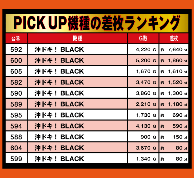 『沖ドキ!BLACK』は+7,000pt超が誕生。+1,000pt超が5台と実力をフルに発揮している。