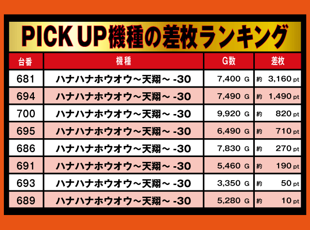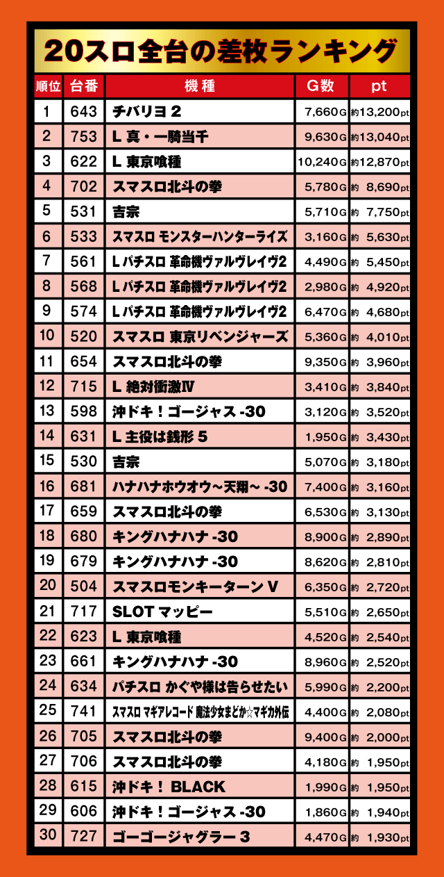 『チバリヨ2』643番台がと『L 真・一騎当千』753番台が+13,000ptと、圧巻の成績をおさめていた。さらに『L 東京喰種』622番台も+12,000ptと続く。『スマスロ北斗の拳』702番台が+8,690pt、『吉宗』531番台が+7,750ptなど、かなりの優秀台がひしめき合う豪華なデータとなっていた。