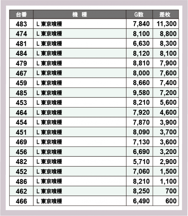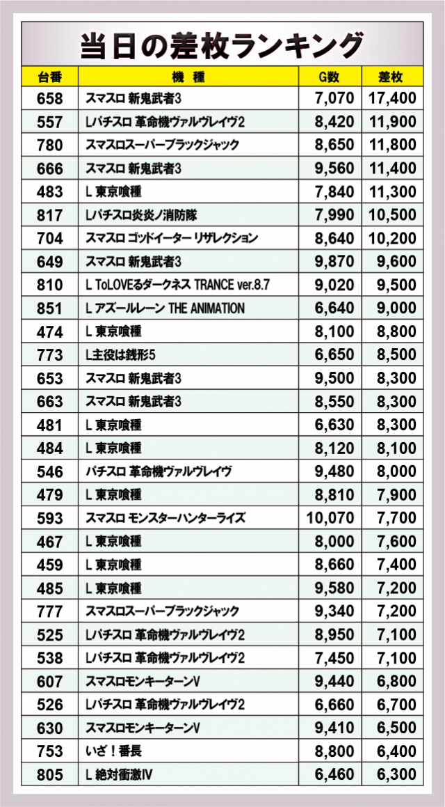 ※差枚数順に掲載しています