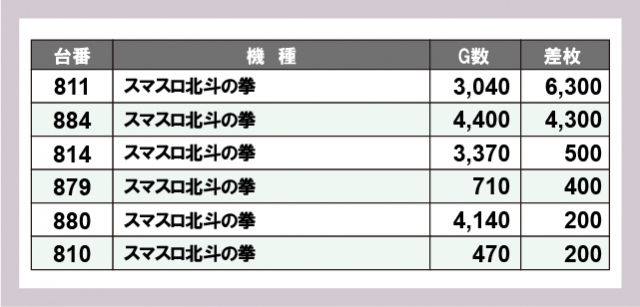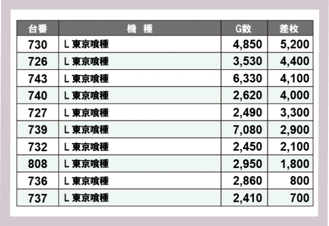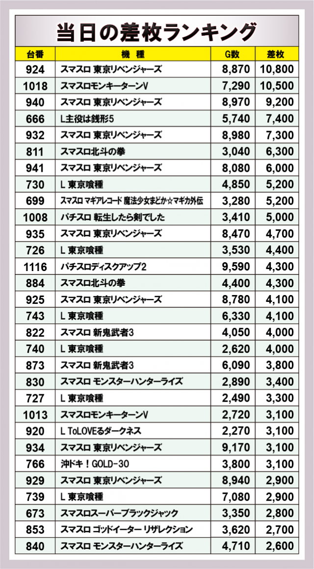 ※差枚数順に掲載しています