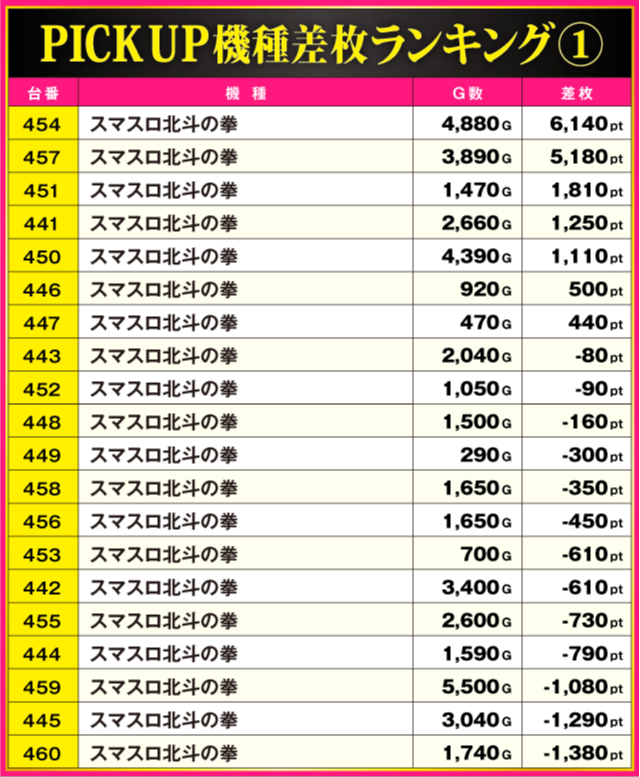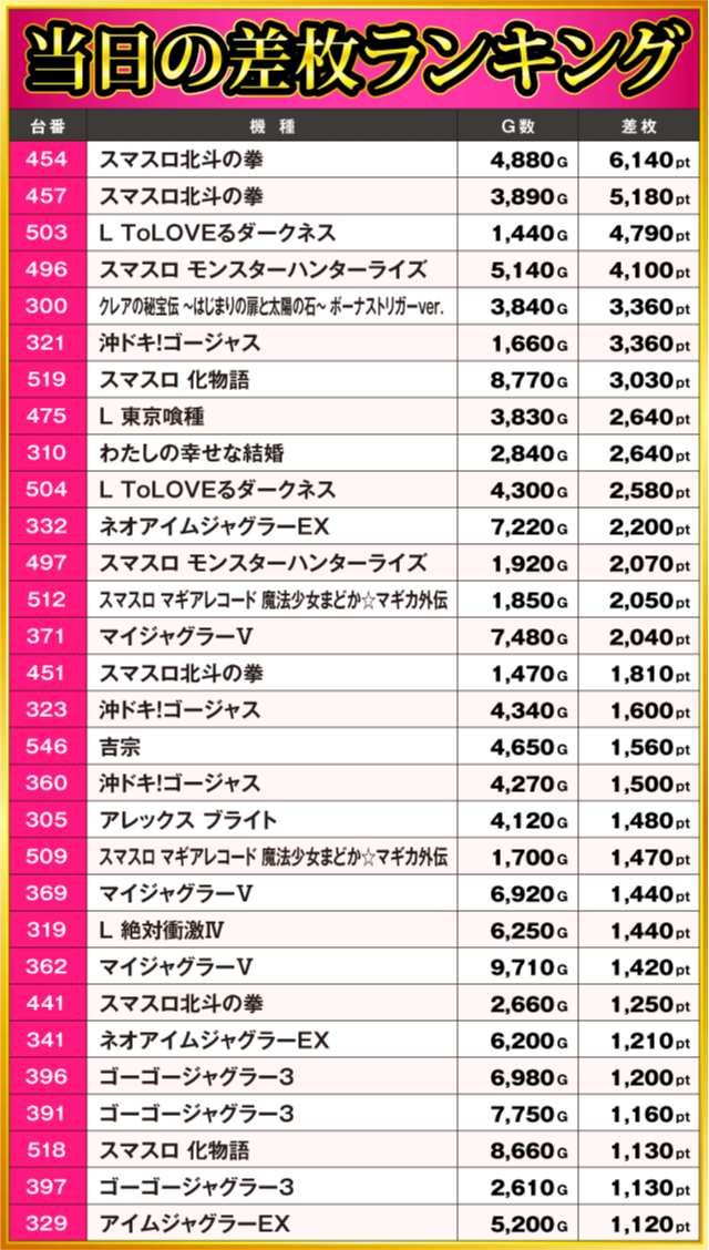 当日の差枚ランキング
