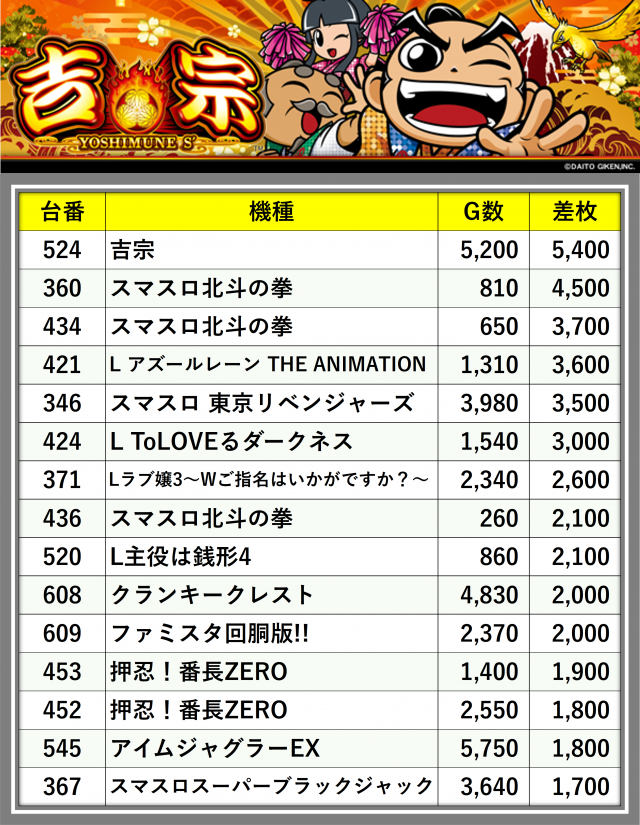 厳選された取材対象機種をはじめ、その他スロット全体から好記録が飛び出した!プレイヤーが楽しんだ1日を下記データにて振り返ってみて欲しい。