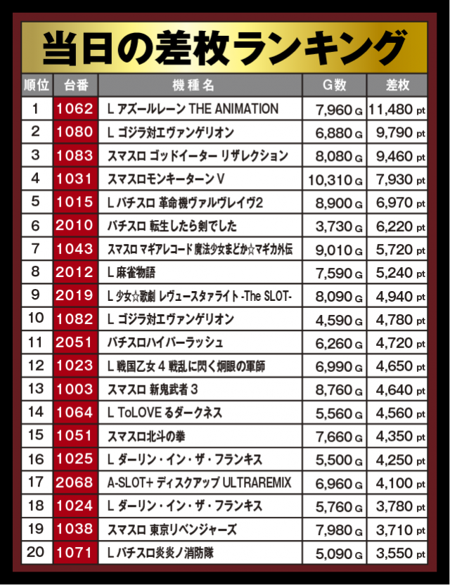 この日のSAPグループはひと味違う。DMMぱちタウンは、「SAP立川店」の特別なひとときを一斉取材した。特に華々しい活躍を残した機種たちをピックアップして紹介しよう。まずは差枚ランキングの発表だ!