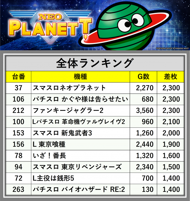 厳選された取材対象機種をはじめ、その他スロット全体から好記録が飛び出した!プレイヤーが楽しんだ1日を下記データにて振り返ってみて欲しい。
