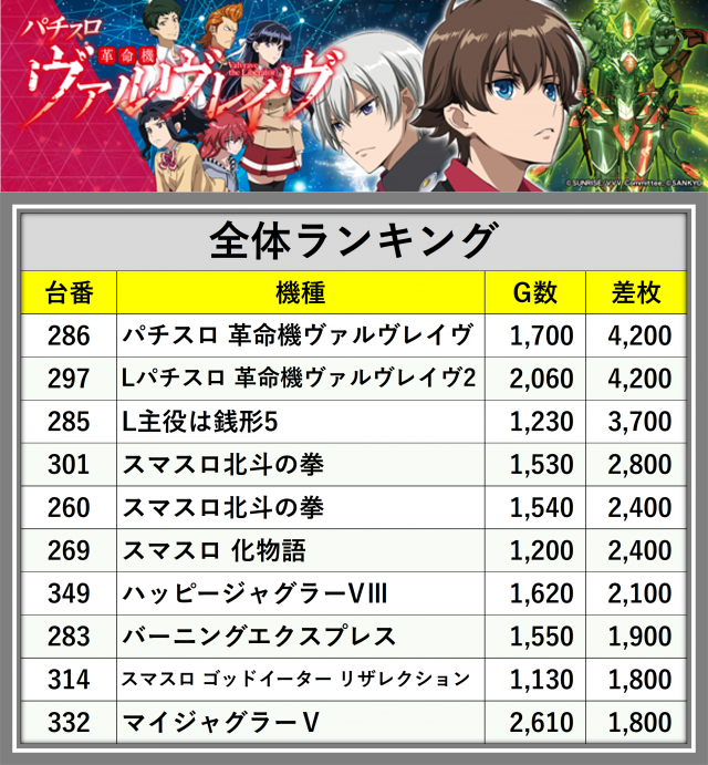 ※差枚数順に掲載しています