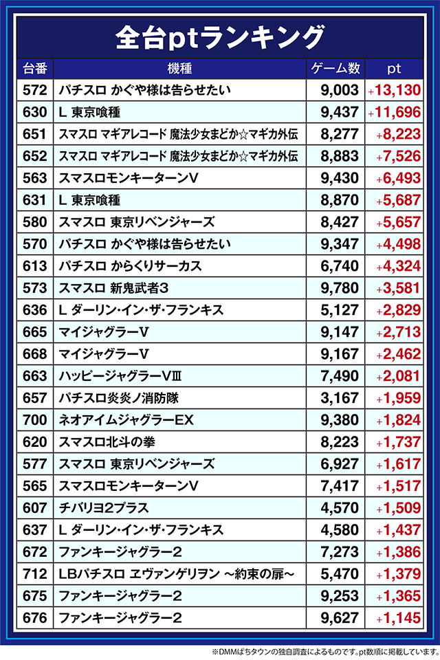 「スマスロモンキーターンV」の563番台は+6,493pt、「スマスロ 東京リベンジャーズ」の580番台も+5,657ptと、いくつもの台が盛り上がりをみせた。
