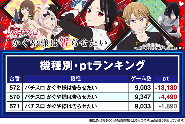 「パチスロ かぐや様は告らせたい」の572番台が+13,130pt!