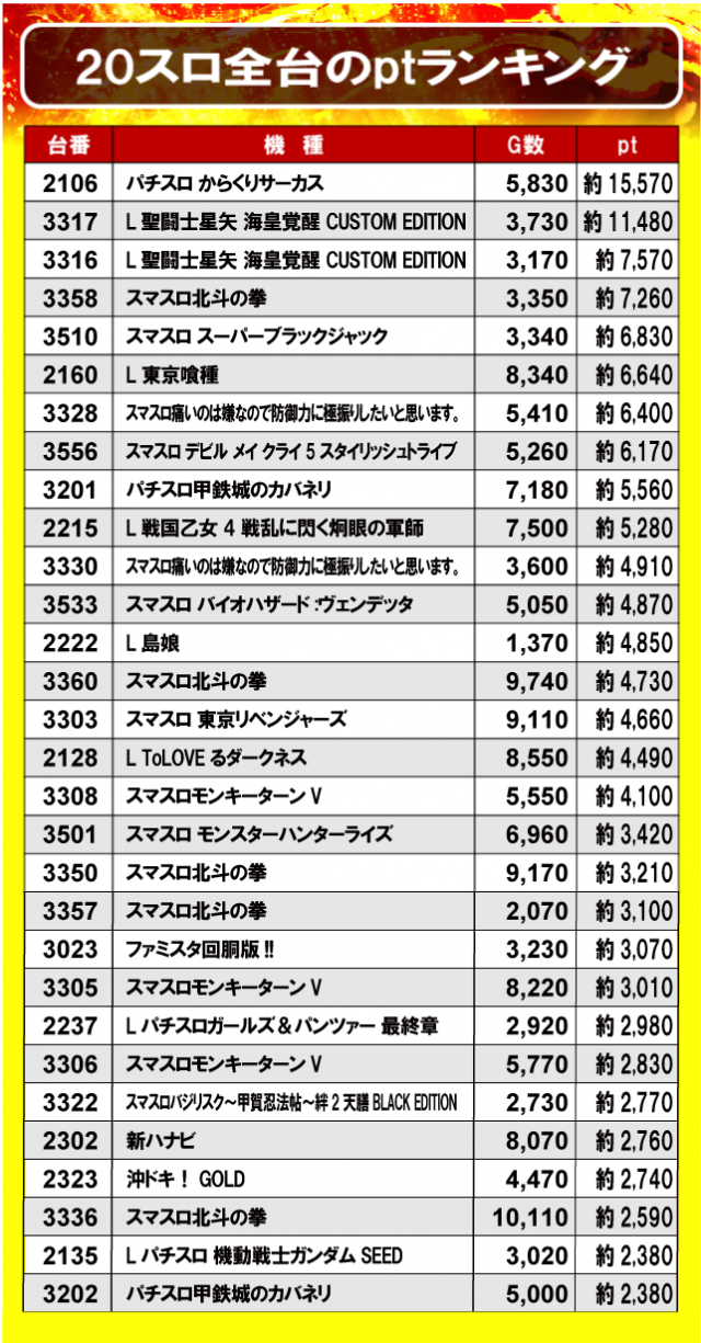 ①20スロ全台のptランキング