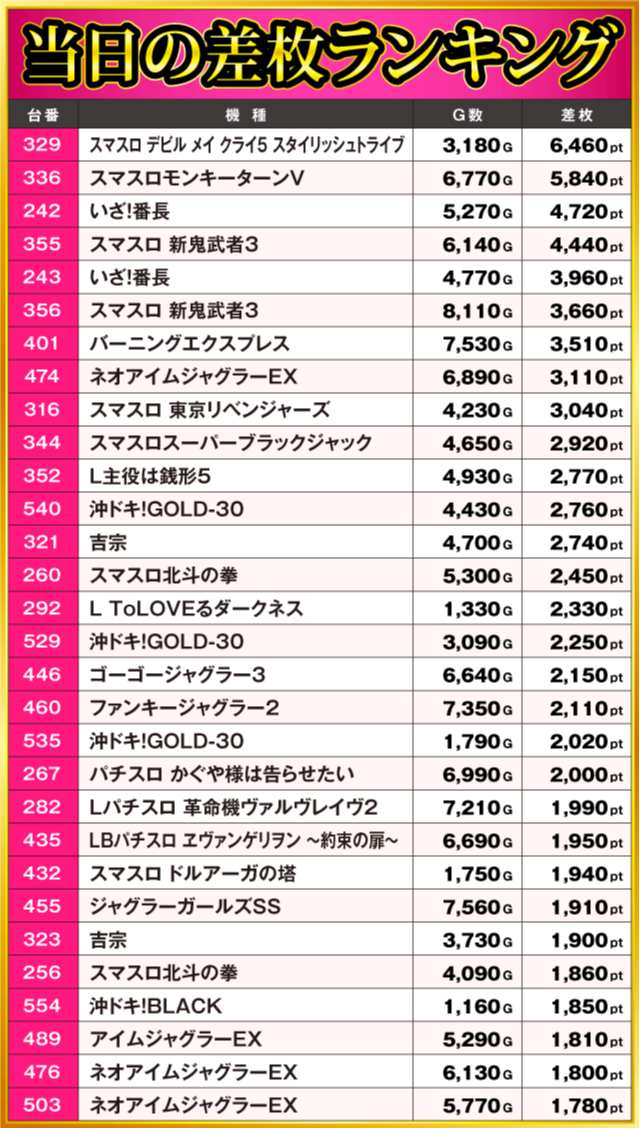 店内状況をチェックしていくと、人気のスマスロを中心にハイスコアが続出。そんな中、『スマスロ デビル メイ クライ5 スタイリッシュトライブ』が+6,460ptを叩き出しランキングトップに輝いている。また、『いざ!番長』は差枚TOP5に2台がランクインする盛況ぶりを見せファンを喜ばせていた。