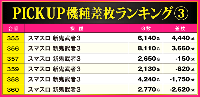 今回のPICK UP機種は全3機種で、『スマスロ 新鬼武者3』は+4,440pt、+3,660ptと好成績を連発。さらに、『いざ!番長』と『Lパチスロ 革命機ヴァルヴレイヴ2』からも多数のプラス差枚台が確認されており、それぞれのシマは常に活気に満ち溢れる一日となった。