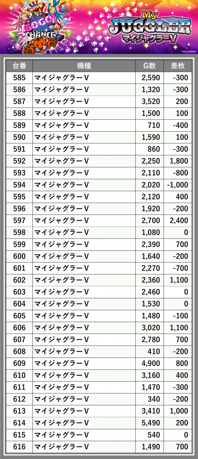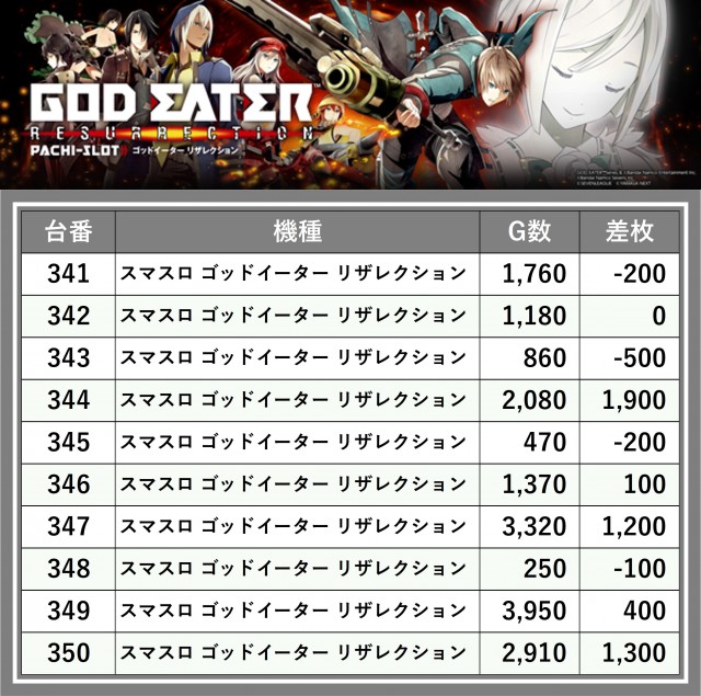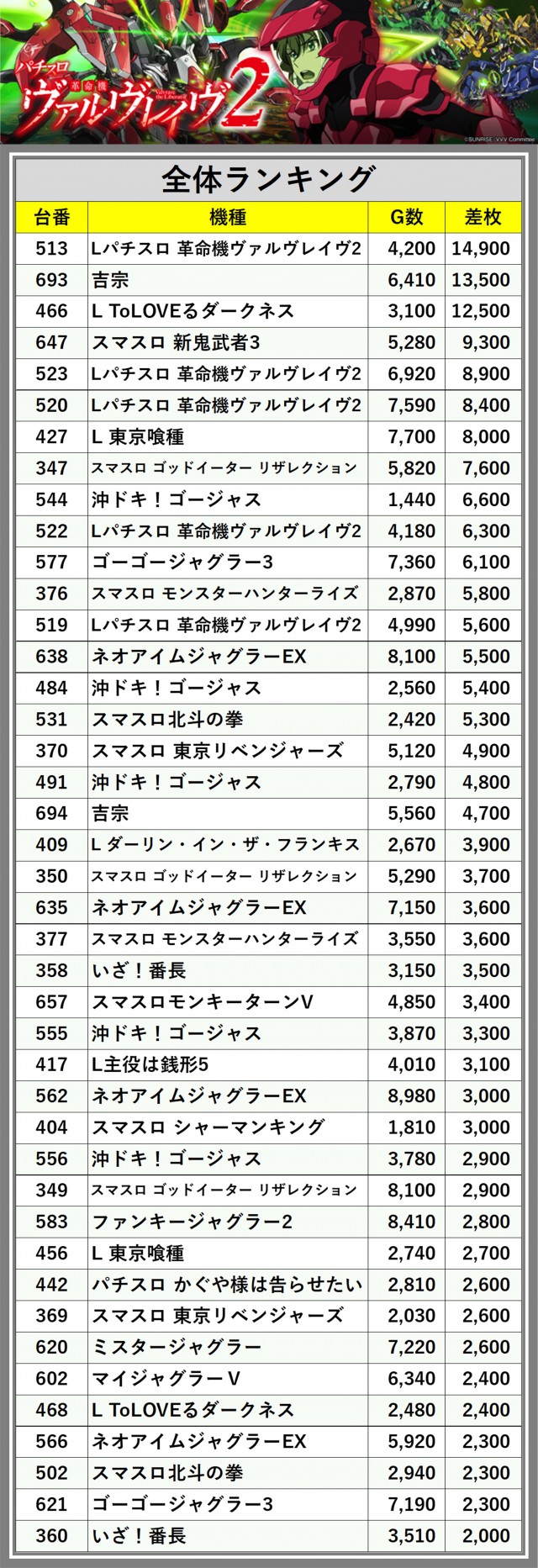 ※差枚数順に掲載しています