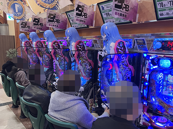 14時半ごろの100円/89玉パチンコを見渡すと「P大海物語4スペシャルBLACK」といった海物語シリーズや、「PAシン・エヴァンゲリオン 99 遊タイム付 ごらくver.」などの自社開発機の盛り上がりが大きい。プレイヤーの活躍を各所で目にしている。