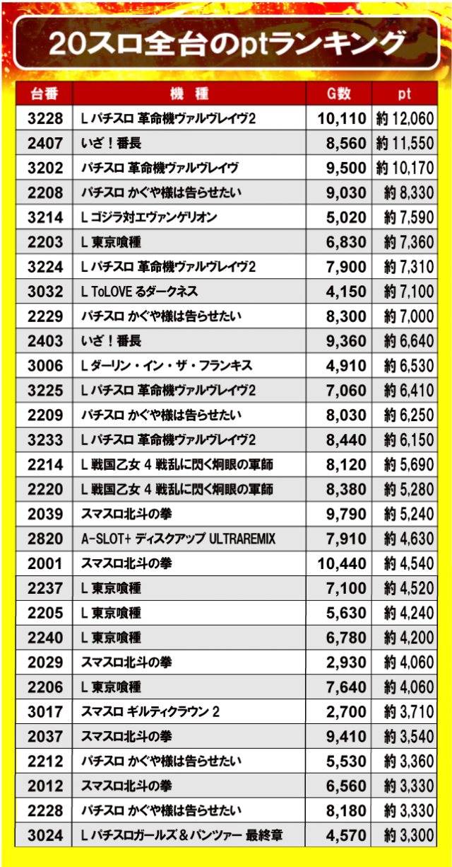 人気機種が中心となって盛り上がりに大きく貢献していた。その結果、『Lパチスロ 革命機ヴァルヴレイヴ2』『いざ!番長』『パチスロ 革命機ヴァルヴレイヴ』から万ptOVERが3台という素晴らしい結果を残した。ランキング全体を見渡しても、人気のスマスロ機を筆頭にまとまったptの多さが目立ち、ファンの期待を裏切らない高いパフォーマンスを披露していたと言えるだろう。