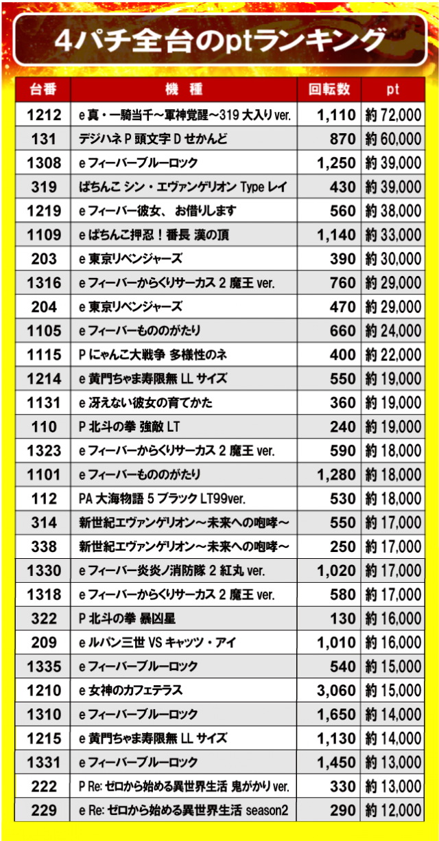 『e真・一騎当千〜軍神覚醒〜319大入りver.』が約72,000ptと首位に立ち、その後を追う『デジハネP頭文字D せかんど』は約60,000ptと素晴らしい結果を収めた。そのほかの台からも好調さが見られ、トップ30のラインは約12,000ptOVERからとなっている点からも同店の実力の高さが窺える内容となった。