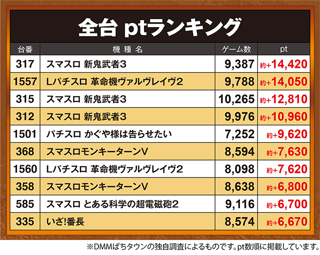 パチスロでは約+5,000ptオーバー、パチンコでは約+25,000ptオーバーとなった台が複数。