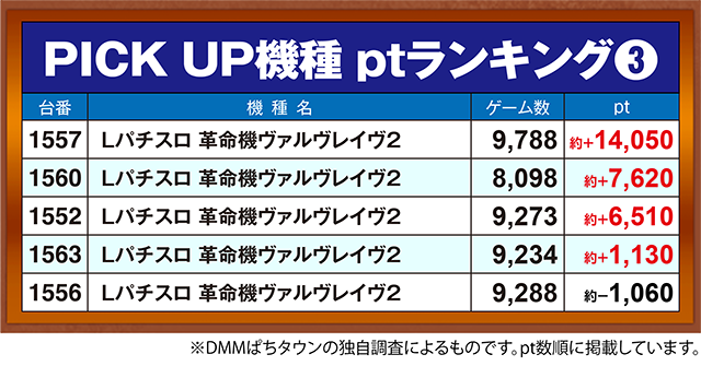 2台が約+7,600ptを超えた「Lパチスロ 革命機ヴァルヴレイヴ2」では、1557番台が約+14,000ptオーバー。