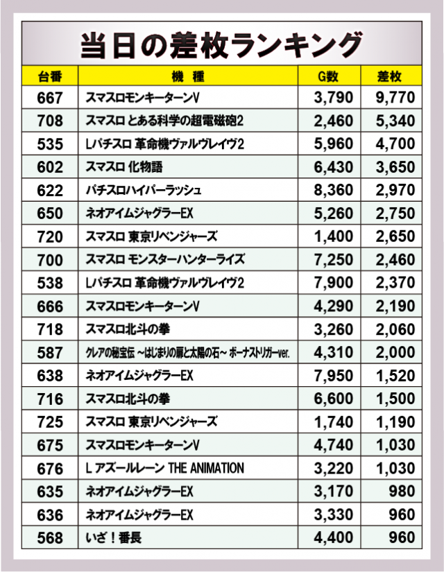 差枚ランキングを見渡すと、スマスロ勢が存在感を放ちながら上位を形成。なかでも『スマスロモンキーターンV』がG数・差枚ともに文句なしの内容を披露した。加えて『スマスロ とある科学の超電磁砲2』『Lパチスロ 革命機ヴァルヴレイヴ2』『パチスロハイパーラッシュ』など、多彩な機種がバランス良くランクイン。突出した一機種頼りではなく、複数ポイントから結果が生まれており、ホール全体にチャンスが散らばっていたことがうかがえる。