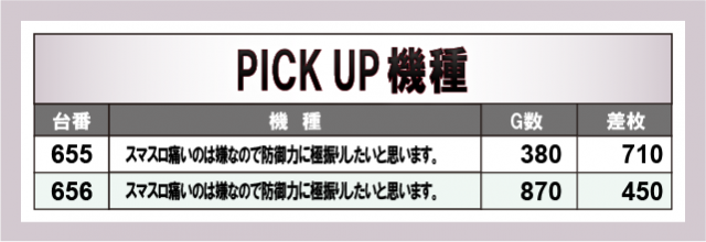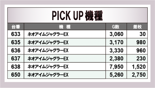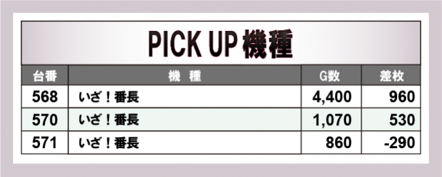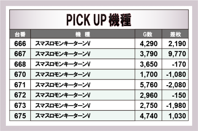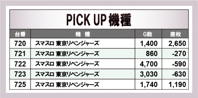 今回のPICK UP機種は、タイプの異なる5機種がそれぞれ存在感を発揮。『ネオアイムジャグラーEX』は複数台がプラス差枚を記録し、安定感ある仕上がりを見せる一方、『スマスロモンキーターンV』では万枚級に迫る差枚を記録し、スマスロらしい破壊力を印象づけた。そのほか『スマスロ 東京リベンジャーズ』『いざ!番長』『スマスロ痛いのは嫌なので防御力に極振りしたいと思います。』も要所で存在感を放ち、機種を問わずチャンスが用意されていたことが感じられる内容だった。