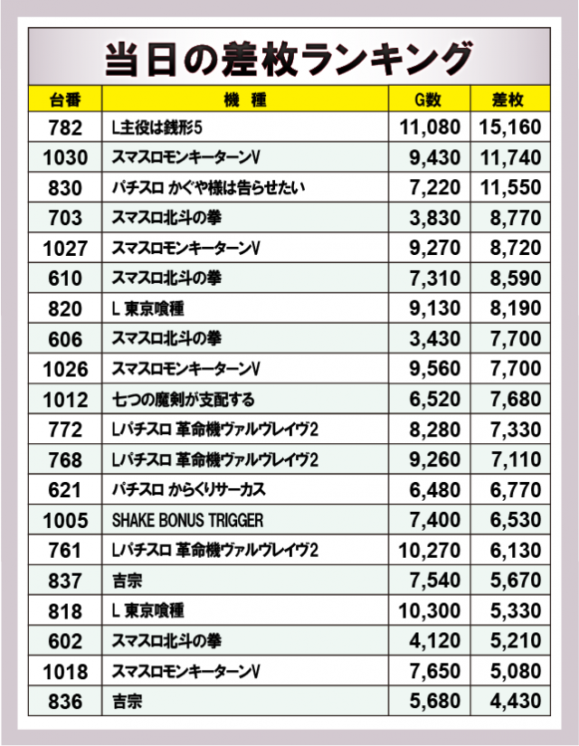 今回の差枚ランキングでは、『L主役は銭形5』が+15,160枚で首位に立ち、頭ひとつ抜けた存在感を示した。続いて『スマスロ モンキーターンV』が+11,740枚、『パチスロ かぐや様は告らせたい』が+11,550枚と、上位帯は万枚クラスが並ぶ非常に濃い構成に。さらに『スマスロ北斗の拳』『L 東京喰種』『Lパチスロ 革命機ヴァルヴレイヴ2』など、定番機種も安定して高差枚を記録しており、上位20台のボーダーが+4,400枚超という全体の底上げを感じる仕上がりとなった。