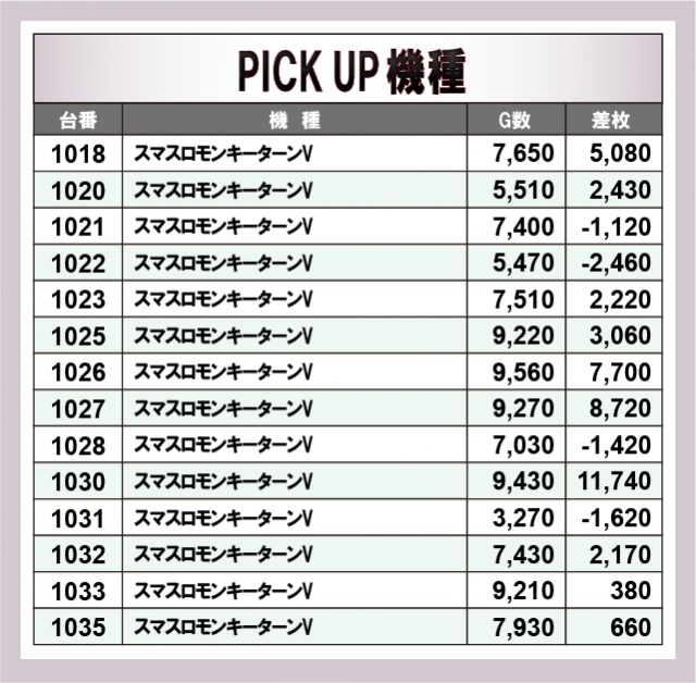 上表3機種に注目すると、『Lパチスロ 革命機ヴァルヴレイヴ2』では最大+7,330枚、+7,110枚を含め、高稼働が継続していた台が多く、波の強さが全体に広がるような推移が確認できた。『L 東京喰種』も+8,190枚、+5,330枚、+4,250枚と軸になる差枚が並び、島全体として見ても地力の高さを感じさせる内容に。さらに、『スマスロモンキーターンV』は1023番台から1030番台で7~9,000Gと高稼働をマークしつつ、万枚OVERを筆頭に+8,720枚、+7,700枚と勢いのある差枚が複数出現!3機種とも、突出した一角だけでなく周囲とのリンク感が確認できる構成で、じわりと厚みを帯びた島状況が読み取れる。