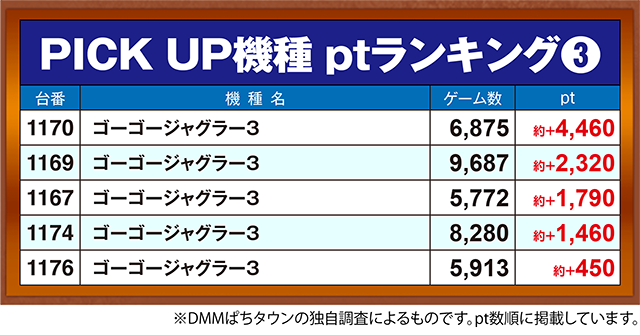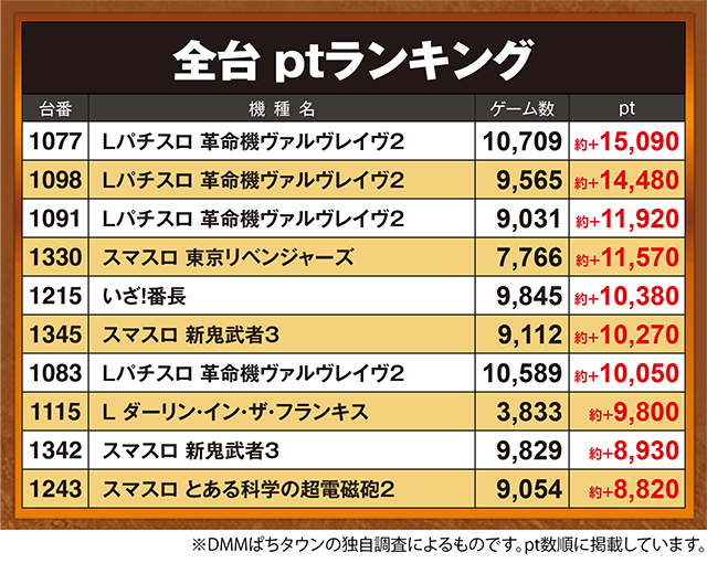 約+6,870ptを記録した1021番台など、複数台が約+3,000ptを超えた。