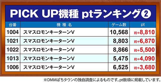 最新機種、定番人気の機種と、活躍がみられた機種は多種多彩。パチスロでは7台が約+10,000ptを上回った。