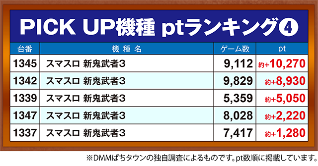 ほかにも、「いざ!番長」の1215番台や「スマスロ 新鬼武者3」の1345番台が約+10,000pt以上となった。