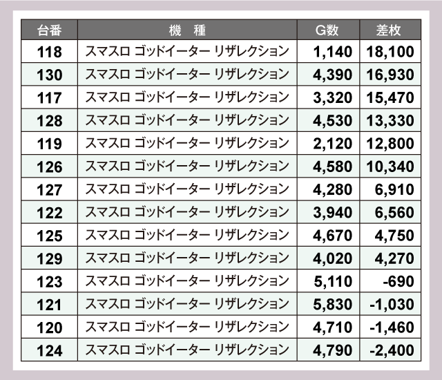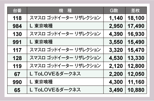 この日は、とにかく『スマスロ ゴッドイーター リザレクション』がアツかった!! 差枚ベスト10に5台がランクインしている上に、その全てが万枚超を達成する大盤振る舞い。なかでも、118番台が怒涛の+18,100枚を叩き出しプレイヤーの注目を集めていた。
