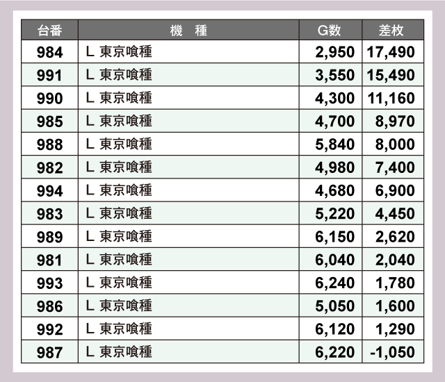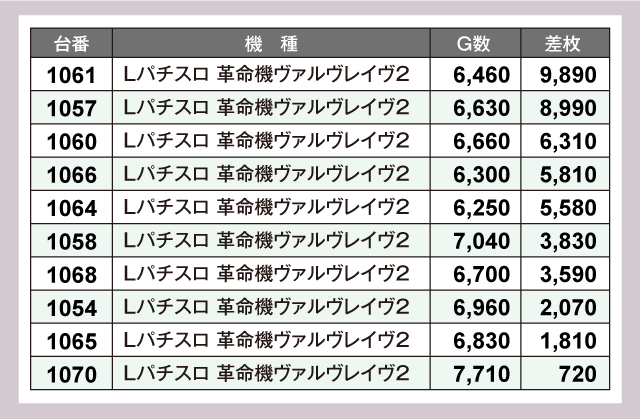 また、その他の機種からも大量の好調台が確認されており、『L 東京喰種』は全14台中13台がプラス差枚、そのうち3台が万枚超を記録する盛況ぶりを披露。さらに、『Lパチスロ 革命機ヴァルヴレイヴ2』からも万枚目前の+9,890枚が飛び出している。