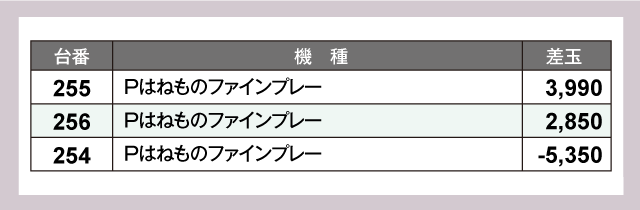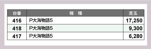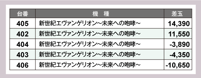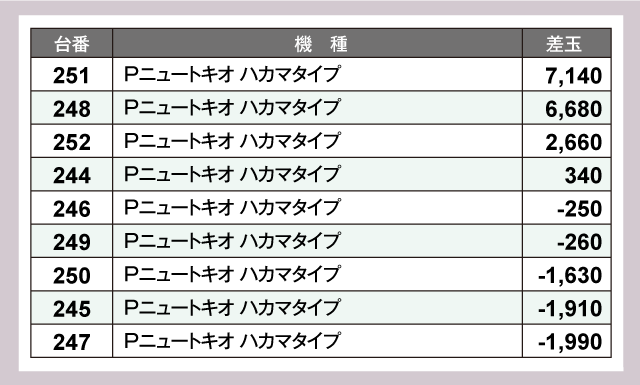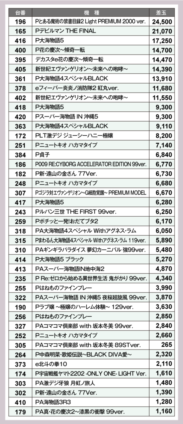 また、他にも『新世紀エヴァンゲリオン〜未来への咆哮〜』から+10,000発超が2台、『P大海物語5』から+17,250発が飛び出すなど、定番の人気機種もしっかりと活躍。さらに、『Pニュートキオ ハカマタイプ』や『Pはねものファインプレー』とった羽根物からも多数の好調台が確認されている。