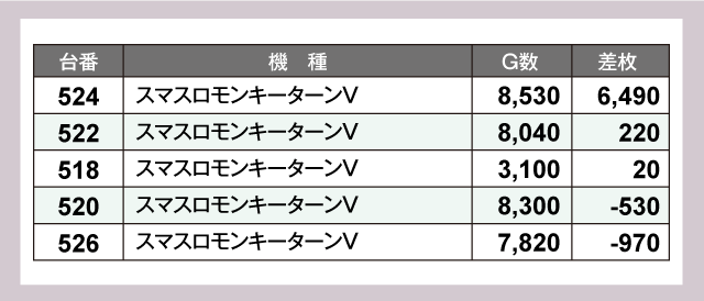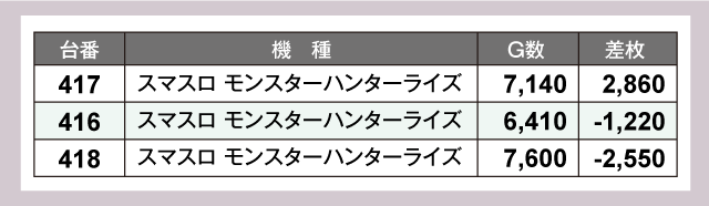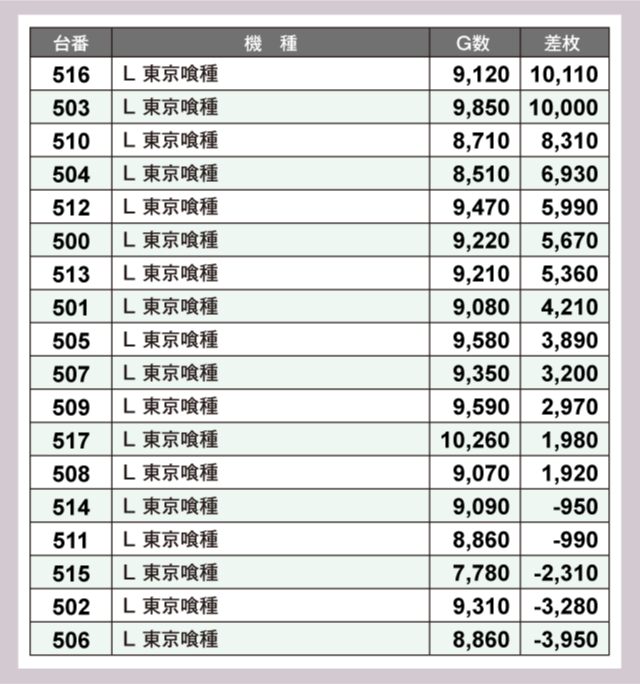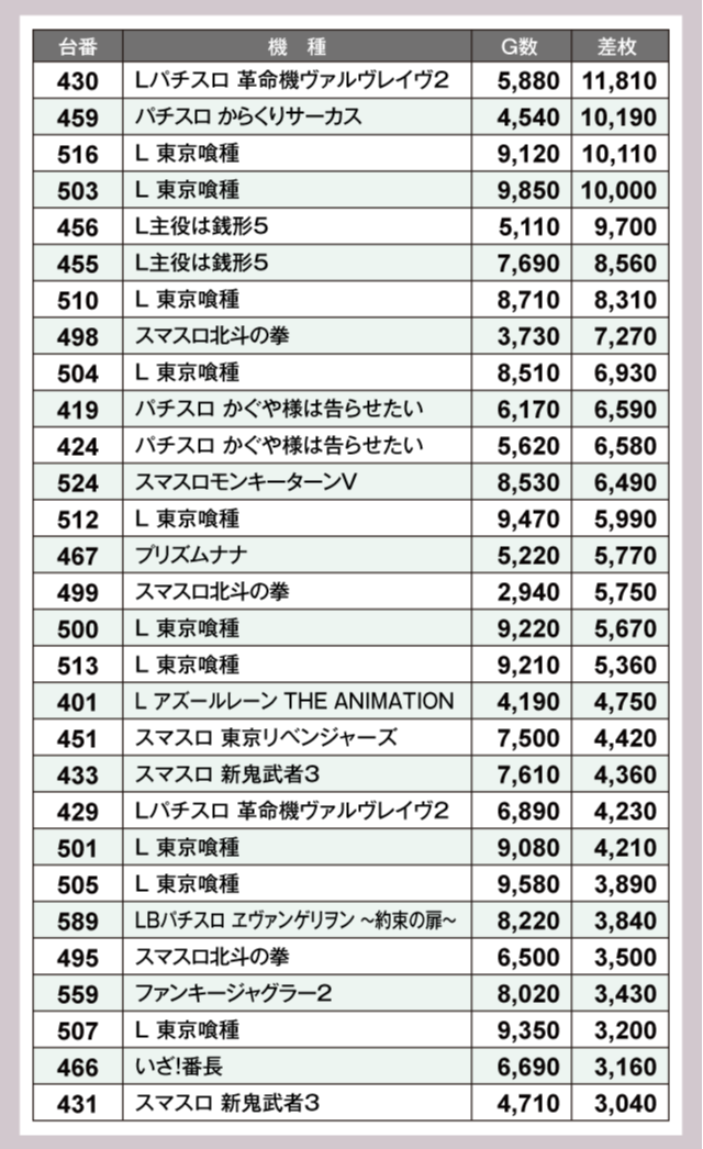 また、その他にも多数の好調台が確認されており、ハイスコアが連発した『L 東京喰種』は最終的に全18台中13台がプラス差枚に。そして、『スマスロモンキーターンV』が+6,490枚、『スマスロ 新鬼武者3』が+4,360枚を記録するなど、人気のスマスロを中心に見せ場満載の一日となっていた。
