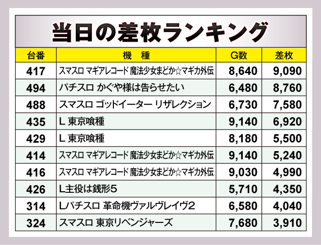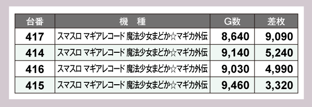 ひときわ輝いていたのは『スマスロ マギアレコード 魔法少女まどか☆マギカ外伝』417番台で、9,000枚オーバーの大活躍。そこに『パチスロ かぐや様は告らせたい』494番台、『スマスロ ゴッドイーター リザレクション』488番台が負けず劣らずの好成績でつづいていた。