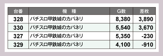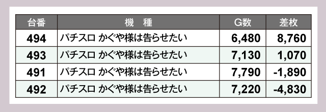 機種ごとに見てみると、『スマスロ マギアレコード 魔法少女まどか☆マギカ外伝』は4台すべてがプラスなのにくわえ、いずれも3,000枚オーバーと誰もがうらやむ好結果となった。『パチスロ かぐや様は告らせたい』と『パチスロ甲鉄城のカバネリ』はどちらも4台中2台がプラスで、こちらも大幅プラス差枚を計上している。