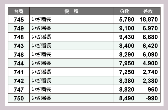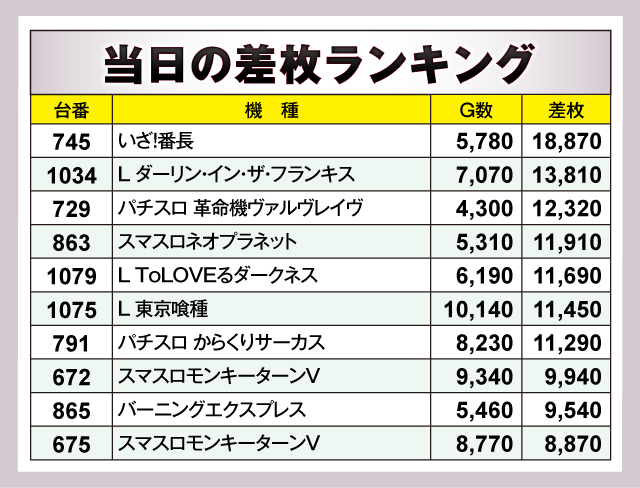 差枚のトップを飾ったのは『いざ!番長』。745番台が+18,870枚と圧倒的な成績をのこしている。そこに『L ダーリン・イン・ザ・フランキス』1034番台が+13,810枚、『パチスロ 革命機ヴァルヴレイヴ』729番台が+12,320枚でつづく。結果、万枚オーバーが7台と豪華絢爛なランキングとなっていた。
