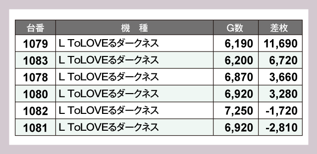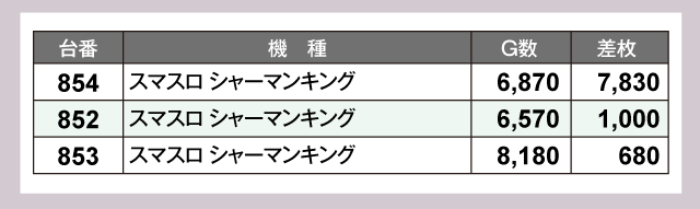 機種ごとに見てみると、『いざ!番長』は10台中9台がプラスと驚異の打率を誇っている。『L ToLOVEるダークネス』は6台中4台が大幅プラス。『スマスロ シャーマンキング』は3台すべてがプラス差枚と、打っていたプレイヤーも満足の大活躍だった。