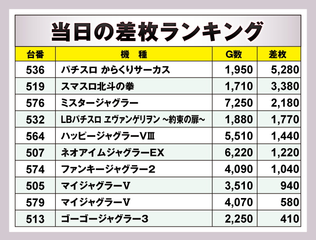 当日のランキングは『パチスロ からくりサーカス』の5,000枚オーバーを筆頭に、スマスロのみならずメダル機からも多彩なラインナップがランクイン。