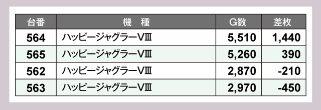 定番『ジャグラーシリーズ』の『ハッピージャグラーVⅢ』では、ポテンシャルを活かしきれないマシンもある中、564番台の+1,440枚はじめ4台中2台がプラス差枚を記録した。
