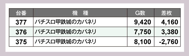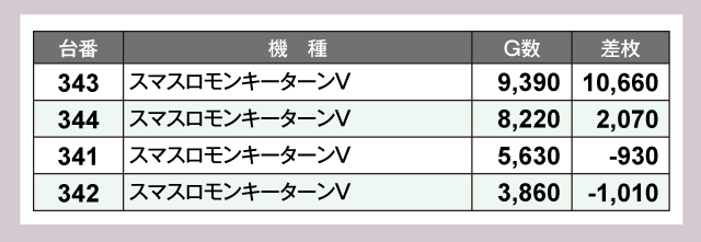 差枚の首位に輝いたのは『パチスロ からくりサーカス』。382番台が+15,560枚と圧倒的な成績をのこしている。そして『スマスロモンキーターンV』343番台が+10,660枚でつづき、万枚オーバーが2台あらわれる好結果となっていた。