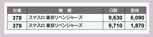 機種をピックアップしてみると、台数が多い『スマスロ北斗の拳』からは優秀台が多数誕生。『パチスロ甲鉄城のカバネリ』や『スマスロ 東京リベンジャーズ』は全台が高稼働で、4桁プラス差枚が2台ずつ生まれている。『スマスロモンキーターンV』はもっともG数が回された343番台が万枚達成と、プレイヤーの期待に応えていた。